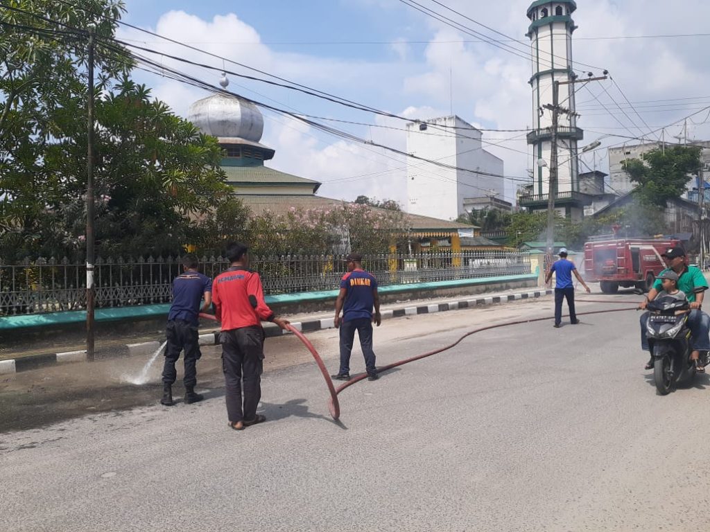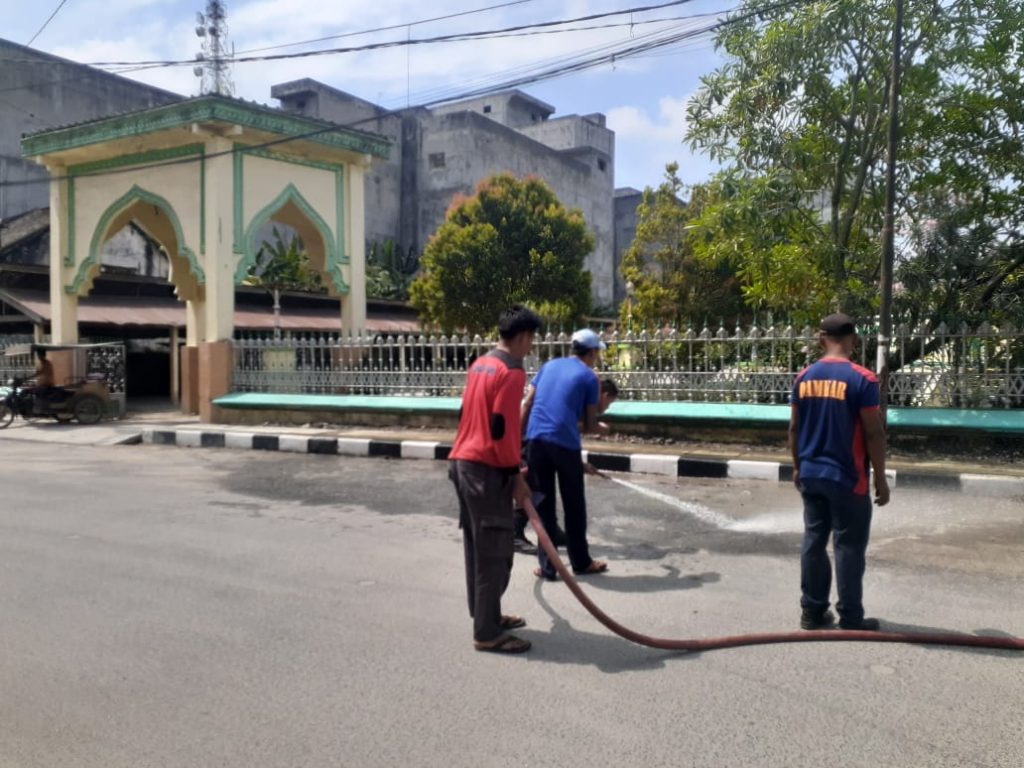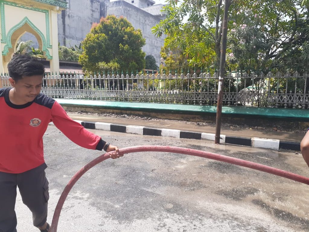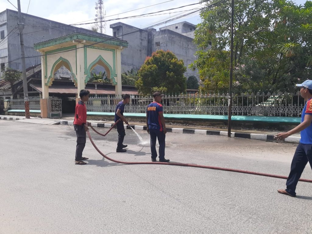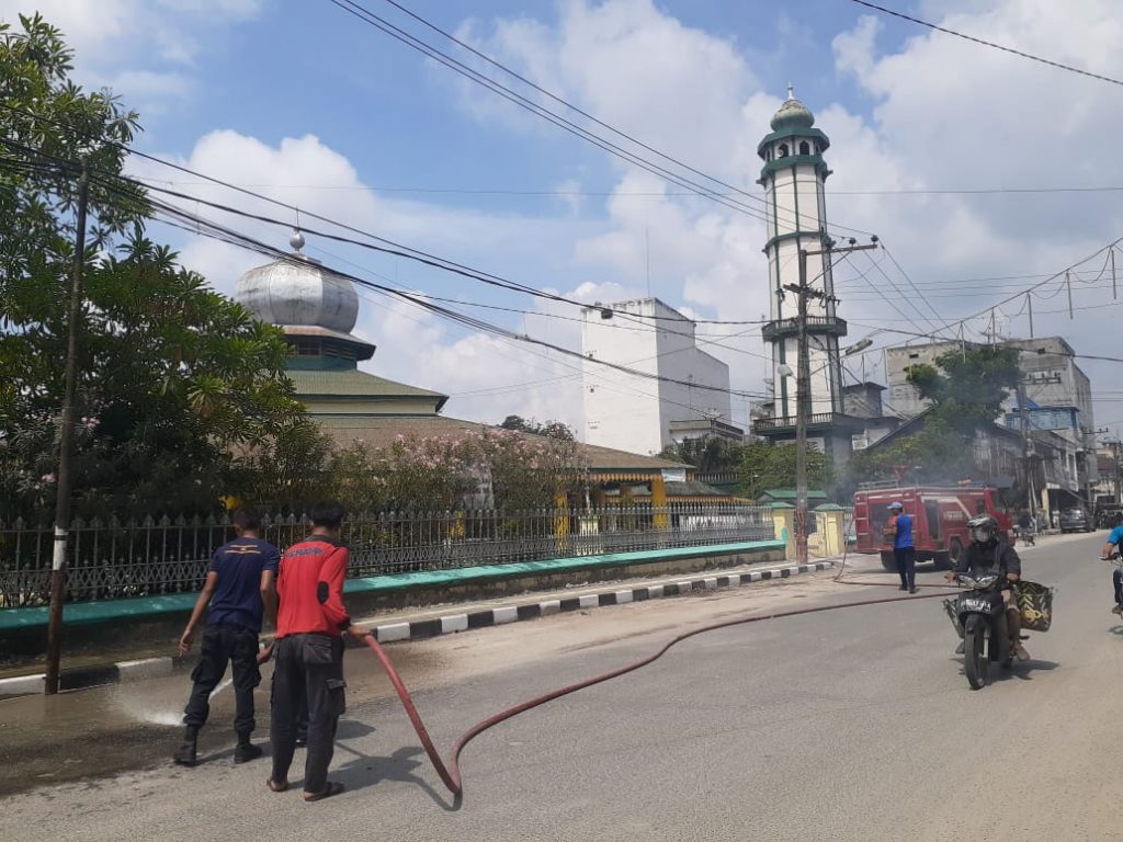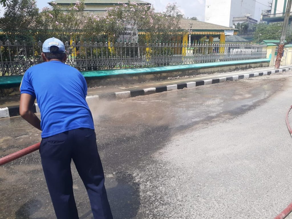 KEGIATAN SATPOL PP BIDANG DAMKAR MENYIRAM JALAN UTAMA MESJI RAYA DARI TUMPUKAN DEBU GUNA MEMBERIKAN KENYAMANAN BERIBADAH DAN PENGGUNA JALAN DI SEKITAR MESJID RAYA KOTA TANJUNGBALAI KEGIATAN TERSEBUT MELIBATKAN SATU UNIT MOBIL DAMKAR. SABTU 25 JANUARI 2020 PUKUL 08.30 Wib.